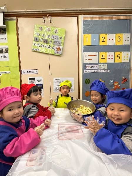 老師首先介紹農曆新年的起源、習俗及與笑口棗相關的文化意涵。隨後,老師示範笑口棗的製作步驟,同學們分組合作動手準備材料。在歡聲笑語中,幼兒完成後一起品嚐自製的笑口棗,並互道「新年快樂」與「笑口常開」,現場氣氛溫馨而熱鬧。透過這次農曆新年的文化活動,幼兒不僅學習了傳統點心的製作工藝,更親身感受到中華文化中「團圓」、「祝福」與「喜慶」的精神,為新年增添了意義非凡的體驗。