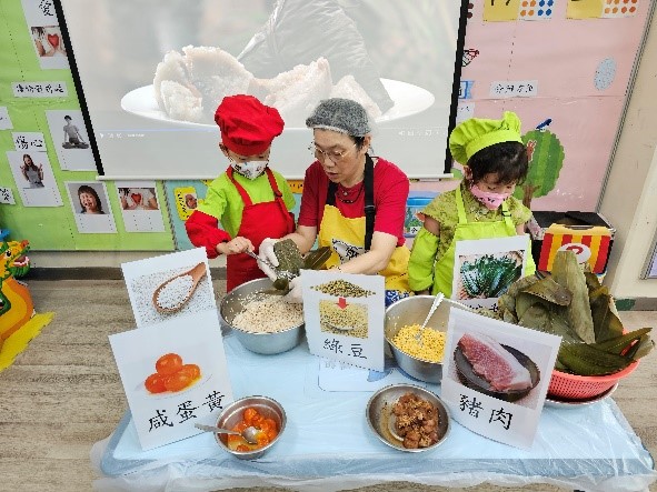學校廚師為幼兒示範包糉的過程。廚師介紹了包糉的材料,包括糯米、豬肉、鹹蛋黃等,並詳細講解了每一個步驟。幼兒在觀看示範的同時,還有機會親自參與包糉,感受製作的樂趣。這個環節不僅增強了幼兒的動手能力,也讓他們更深入地理解端午節的飲食文化。