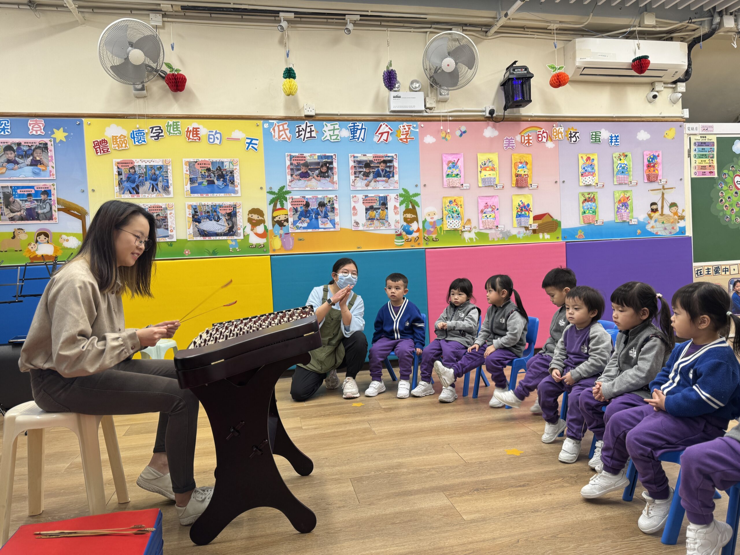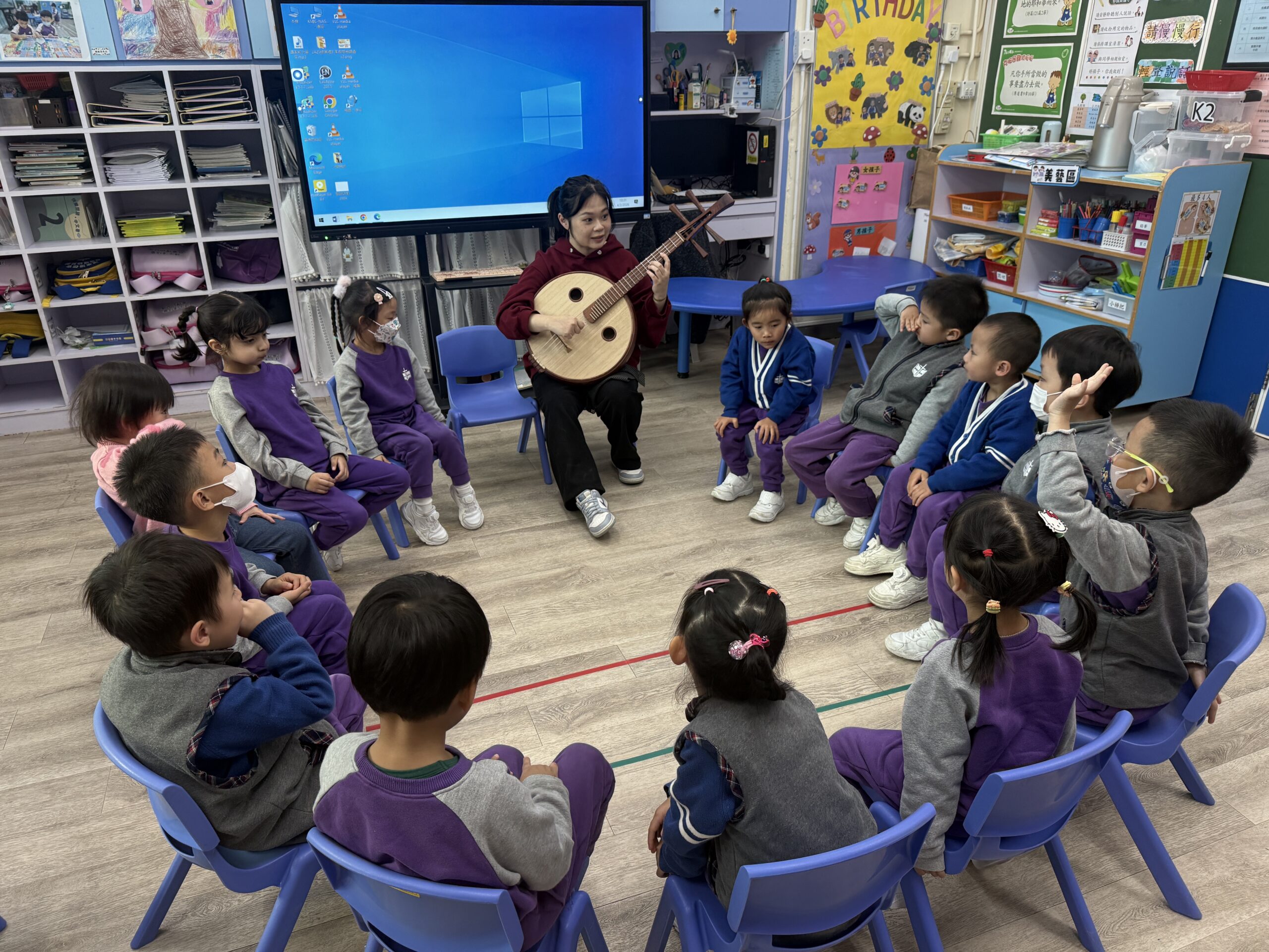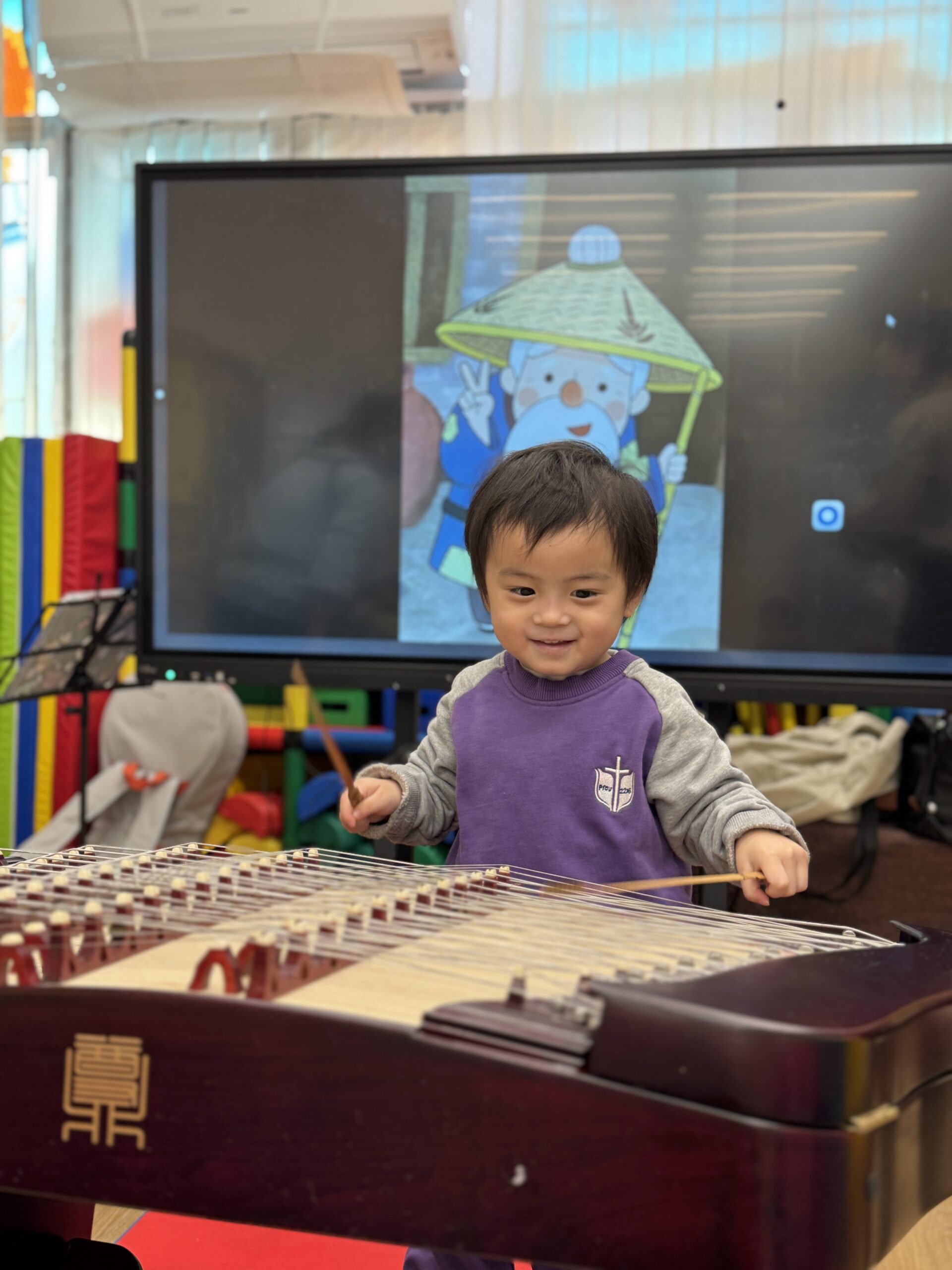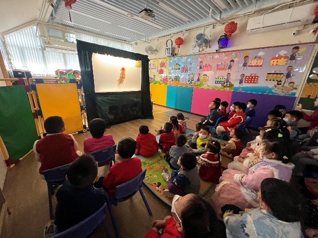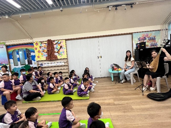 農曆新年將近,學校安排了幼兒參與「用中樂說故事」音樂會,導師配合生動的合奏音樂演繹故事《年獸來了》,提升幼兒對器樂在不同情境應用的理解與想像。隨後,導師更深入介紹樂器的各部分和原理,並示範了不同的有趣技巧和聲效。而幼兒更能近距離觀察及親身體驗試奏中國樂器的樂趣。