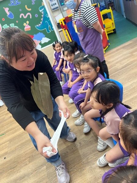 導師特別設計了一系列互動活動,讓幼兒可以在體驗中感受粵劇的精髓,當天我們學習了蘭花手是粵劇表演中的重要手勢之一,優雅而富有美感,教導大家如何運用指尖動作,展現粵劇的韻律和情感;亦有以遊戲方式介紹工尺譜,是一種獨特的記譜方式,讓大家在輕鬆的氛圍下認識粵劇的音樂特色。最後幼兒們更一起學習粵劇舞蹈的一大特色-水袖舞,幼兒可以學習如何運用長長的水袖,表現粵劇中的柔美與氣勢。透過簡單的舞蹈動作,大家能感受到粵劇表演的獨特魅力,也能在優雅的舞姿中體驗粵劇的藝術之美。這場活動結合趣味性與教育性,讓大家在輕鬆的氛圍中學習粵劇的基本知識,並親身體驗這門傳統藝術的魅力。