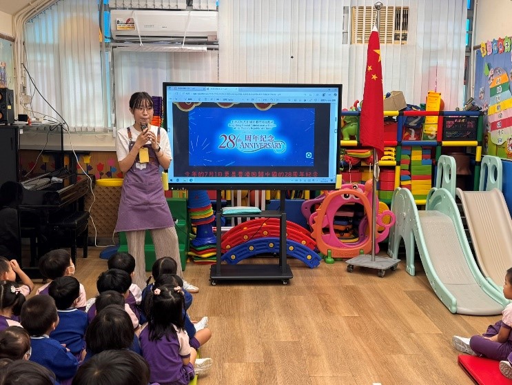 今年是香港特別行政區回歸祖國的第28周年。為了讓幼兒了解這一歷史時刻,建立國家觀念並增強愛國情懷,我們特別安排了「回歸紀念活動」。在活動中,教師介紹香港特別行政區成立紀念日的意義及慶祝活動,並進行升旗禮。幼兒觀察區旗及相關物品,認識洋紫荊花作為香港的象徵。最後,教師播放煙花匯演的影片,讓幼兒感受節日的氛圍,增進對本地文化的理解。