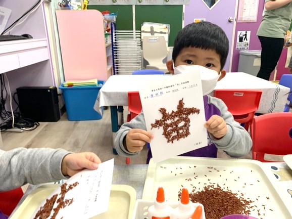 活動二:大豐收(創作角)讓幼兒自選喜歡的「苗」字,手指沿字型作書寫。然後,再運用白膠漿塗在苗字上,選取物料(如米粒、稻殼、豆、糙米等)灑在字卡上,黏貼出「苗」字。