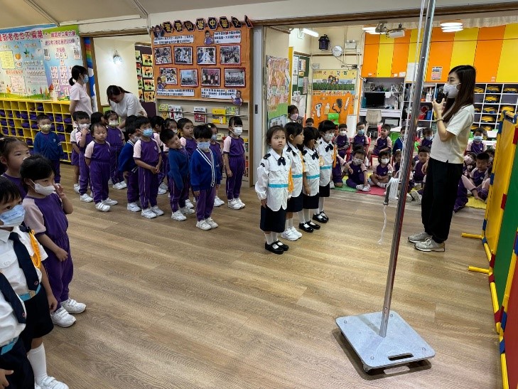 早會時,老師向幼兒介紹全民國家安全教育日會進行「升旗禮」,並幼兒講解進行「升旗禮」時應遵守的禮儀。