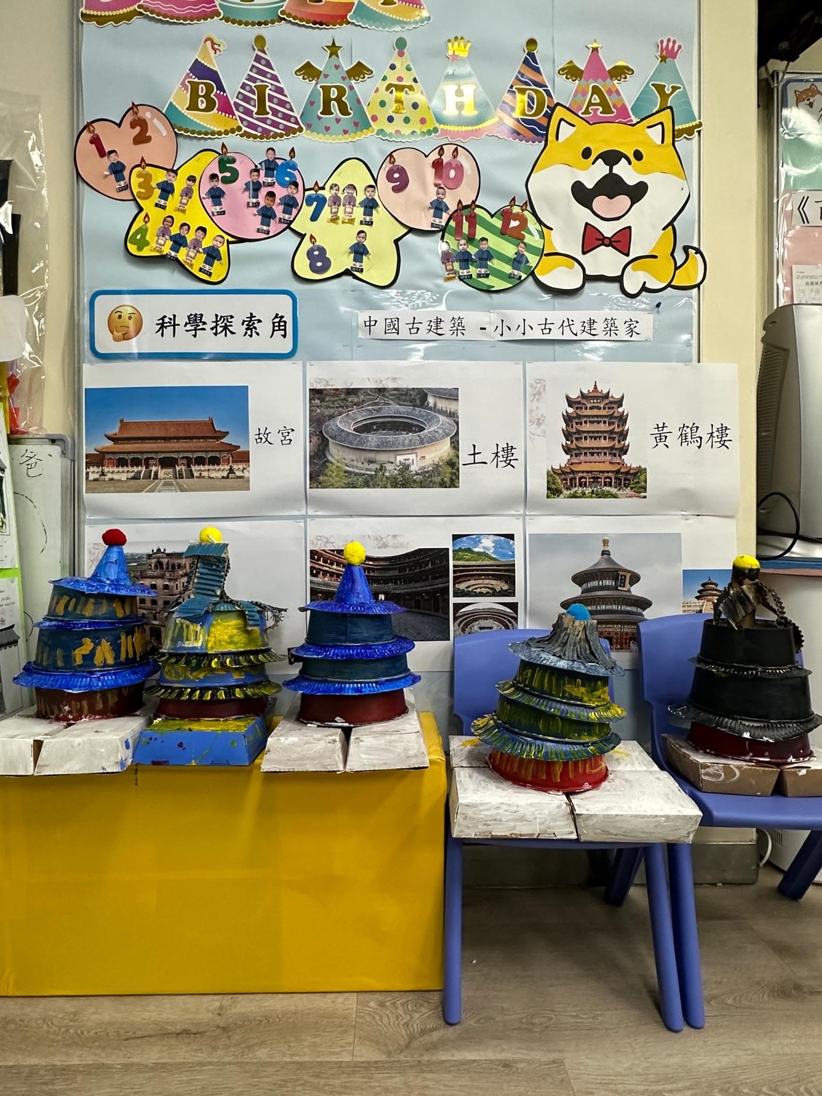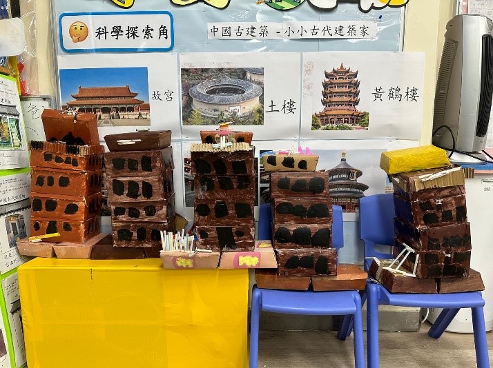 最後,請幼兒展示自己的作品,與同伴互相欣賞,並請幼兒把作品放在國情區內展示,鼓勵幼兒表達對中國建築物的藝術喜愛,及逐漸懂得欣賞中國的千年文化。
