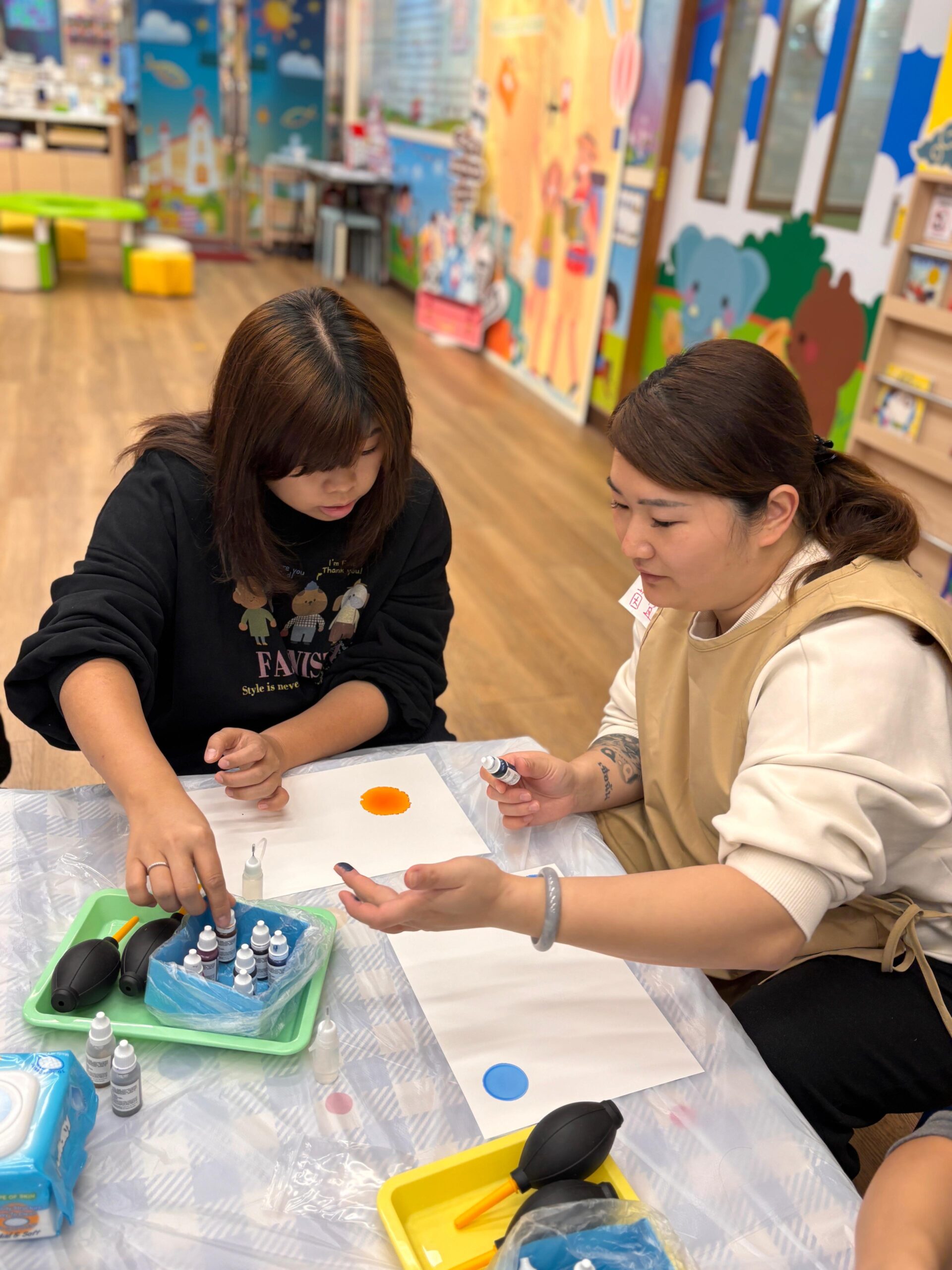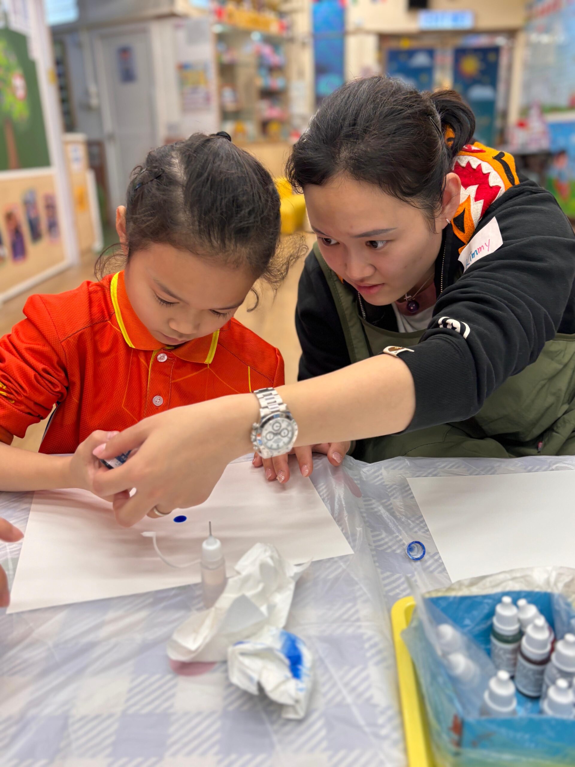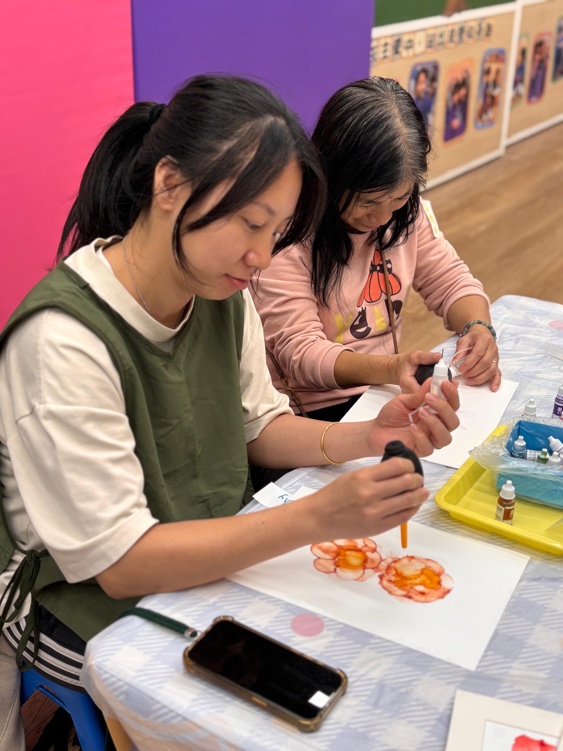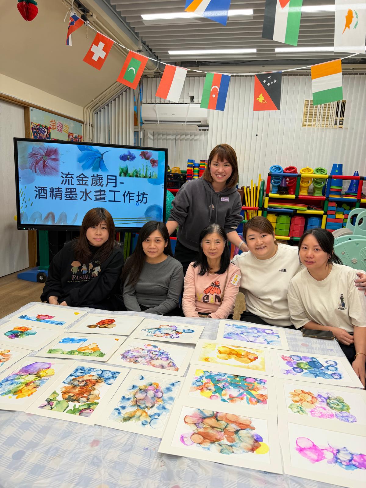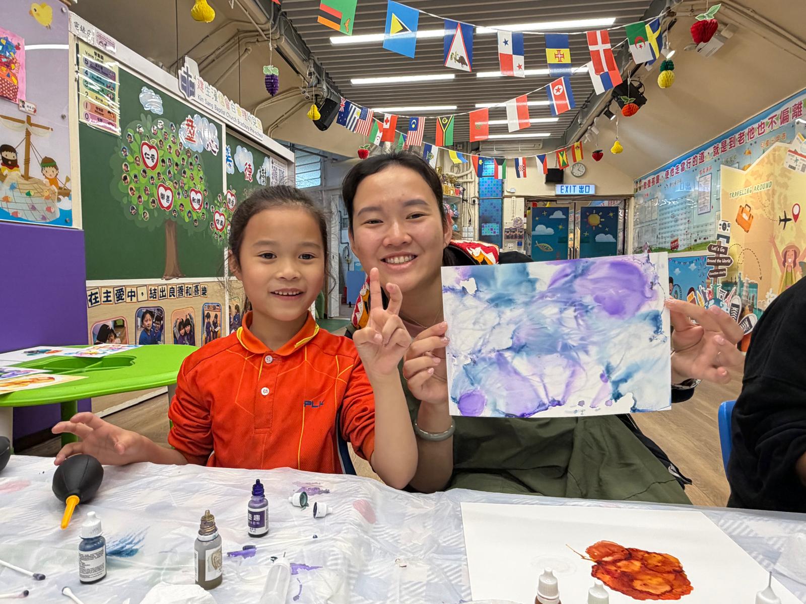「流金歲月」酒精墨水工作坊巧妙融合現代抽象藝術與中華文化元素,透過酒精墨水的流動性及金屬色墨水的華麗光澤,創作充滿東方意境的中式風格繪畫。導師細心指導家長運用酒精墨水的渲染技巧,模擬傳統水墨畫的「暈染」與「留白」效果,並以金色酒精墨水點綴細節,呈現中華文化中象徵高貴璀璨的「流金」質感。家長在工作坊中既能享受創作樂趣,同時體驗「靜心」繪畫帶來的內心平靜與減壓時刻,感受藝術治癒人心的美好力量。
