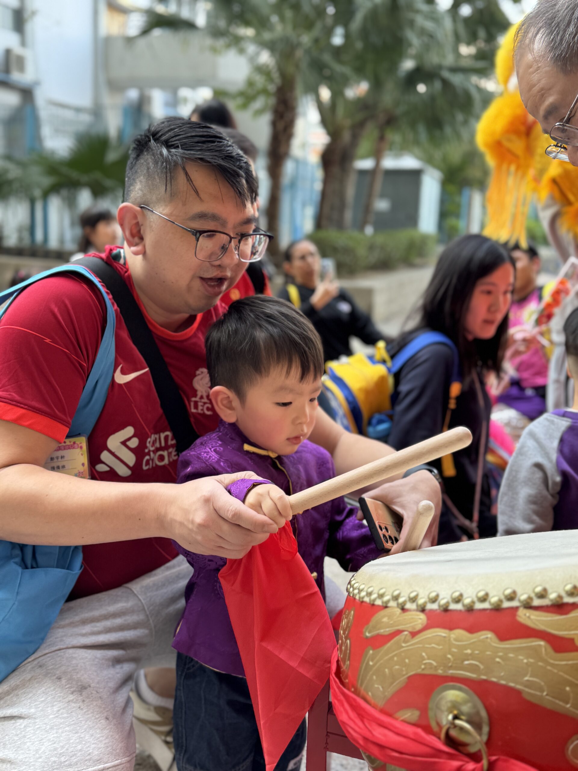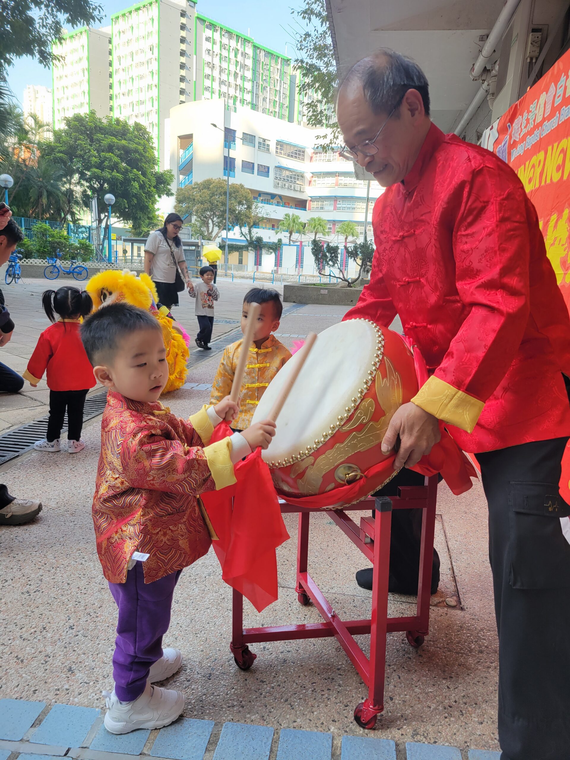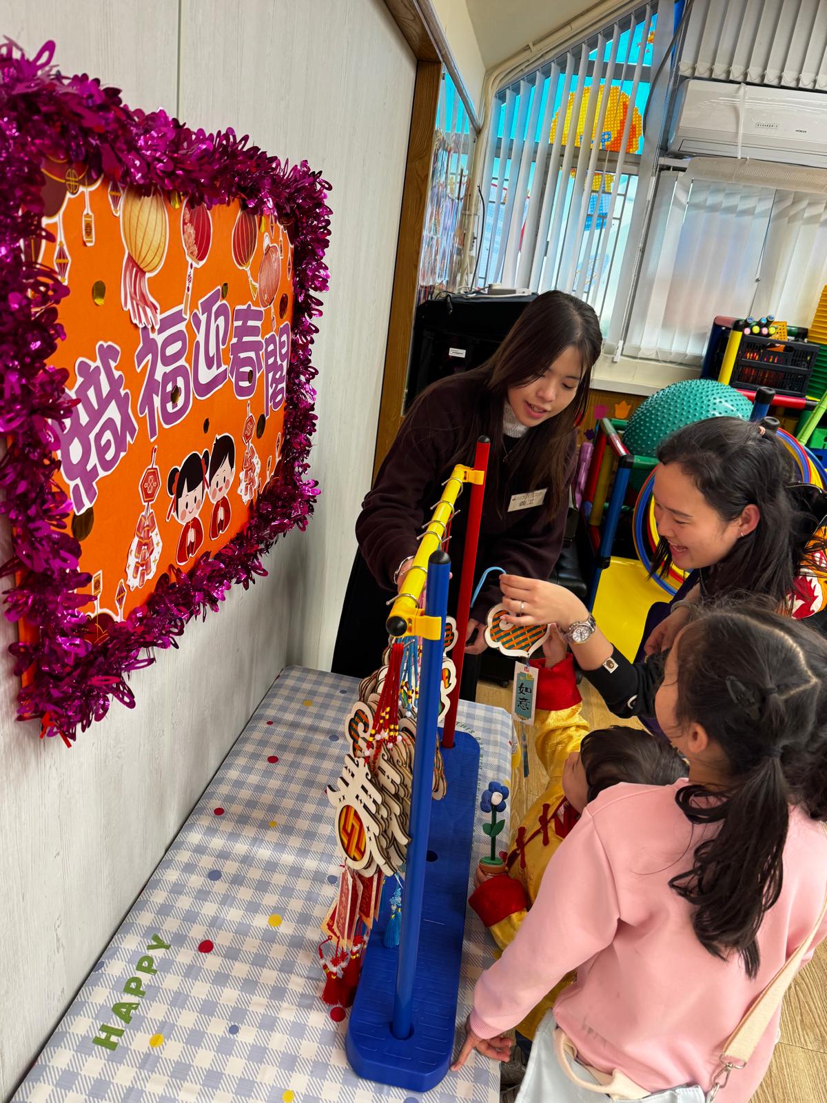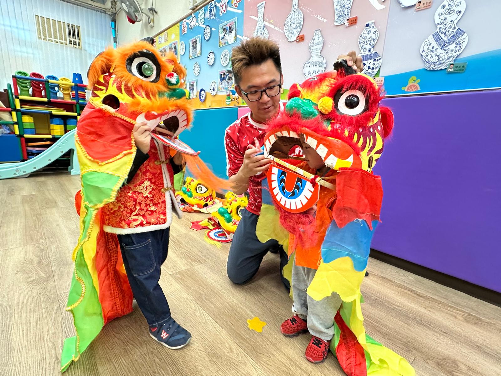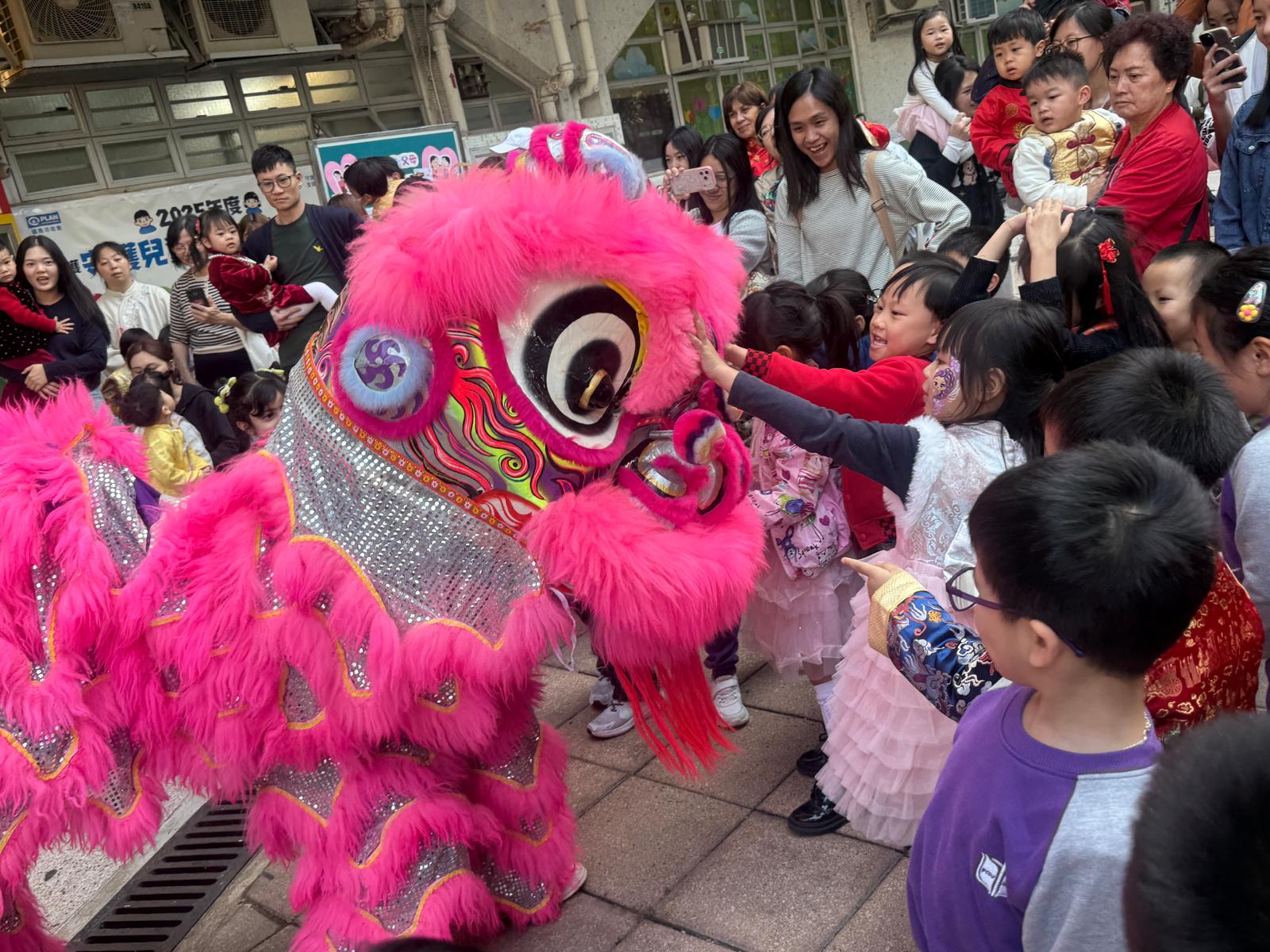 「童樂迎春.喜氣年宵」攤位活動中,大堂化身熱鬧年宵市場,當中包括「花開富貴坊」、「織福迎春閣」、「喜迎好禮站」三個主題攤位。幼兒穿著喜慶華服,與家長於年宵攤位中換領不同的節慶飾品及小禮物。另外,學校更安排了到校舞獅表演,幼兒與家長均興奮地欣賞。隨後,師傅更親身指導幼兒嘗試舞動獅頭、敲響鑼鼓等。當天活動充分展現新年象徵的美好寓意,讓大家在年宵氛圍中體驗喜悅。