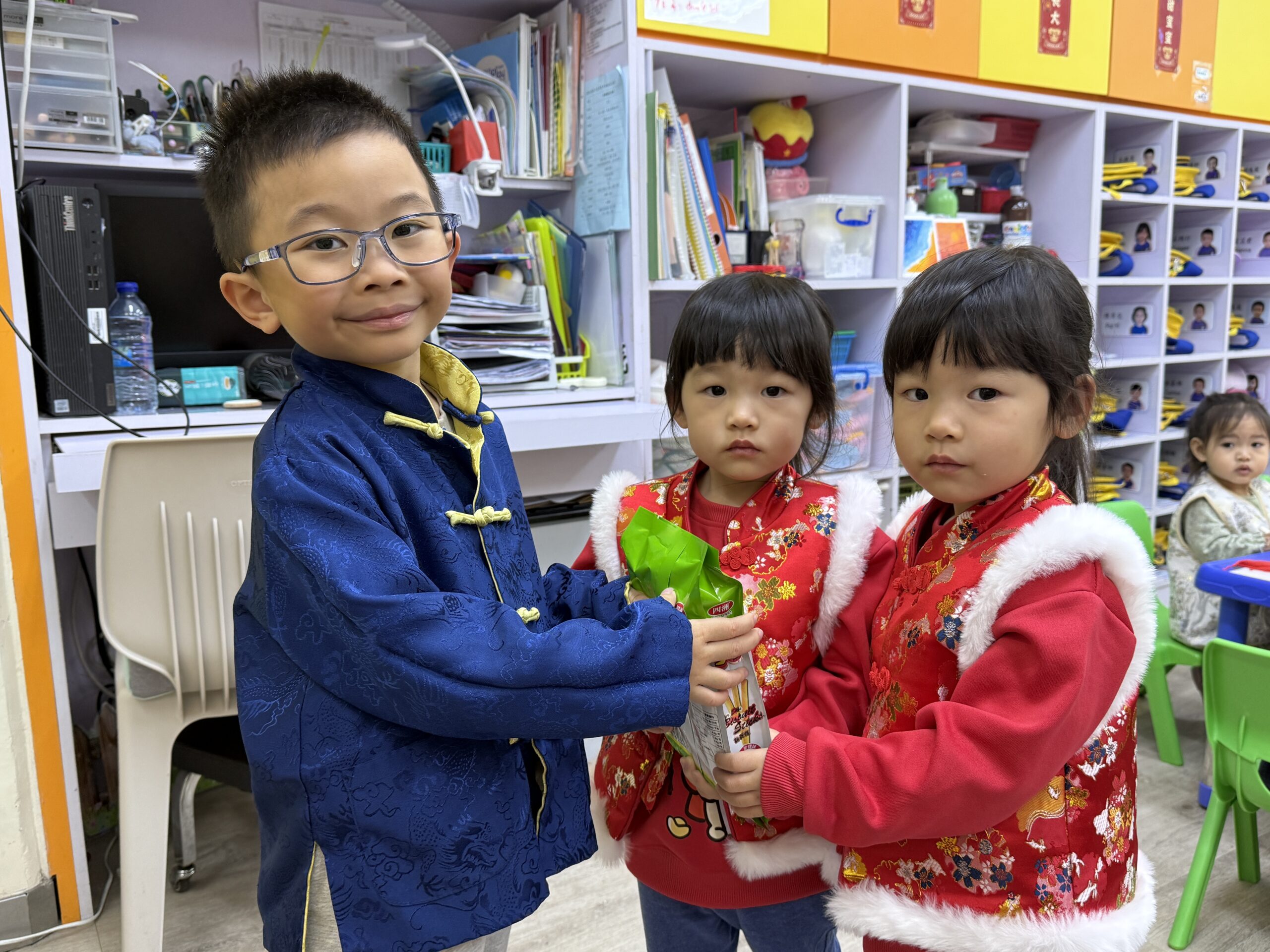 「幼兒新春團拜」透過多元活動,讓幼兒在歡樂氛圍中認識生肖文化、習得新年禮儀,並促進師生同學間的溫馨互動。在分組時間,教師帶領幼兒向師長、同學拜年,幼兒互相拜年送禮,說出「新年快樂」「身體健康」等祝福,充分展現尊重長輩與友愛同學的禮儀,現場洋溢溫馨團圓氣氛。另外,教師更分享了十二生肖故事,解釋生肖由來、順序與動物特性,傳達誠信、合作、努力等正面價值觀。而體適能教練亦帶領了《醒獅賀歲》活動,讓幼兒跟隨律動模仿醒獅動作,活躍身心並感受節慶氣氛。最後,幼兒更一同參與圖工創作及集體遊戲,在歡笑中享受新春喜樂。