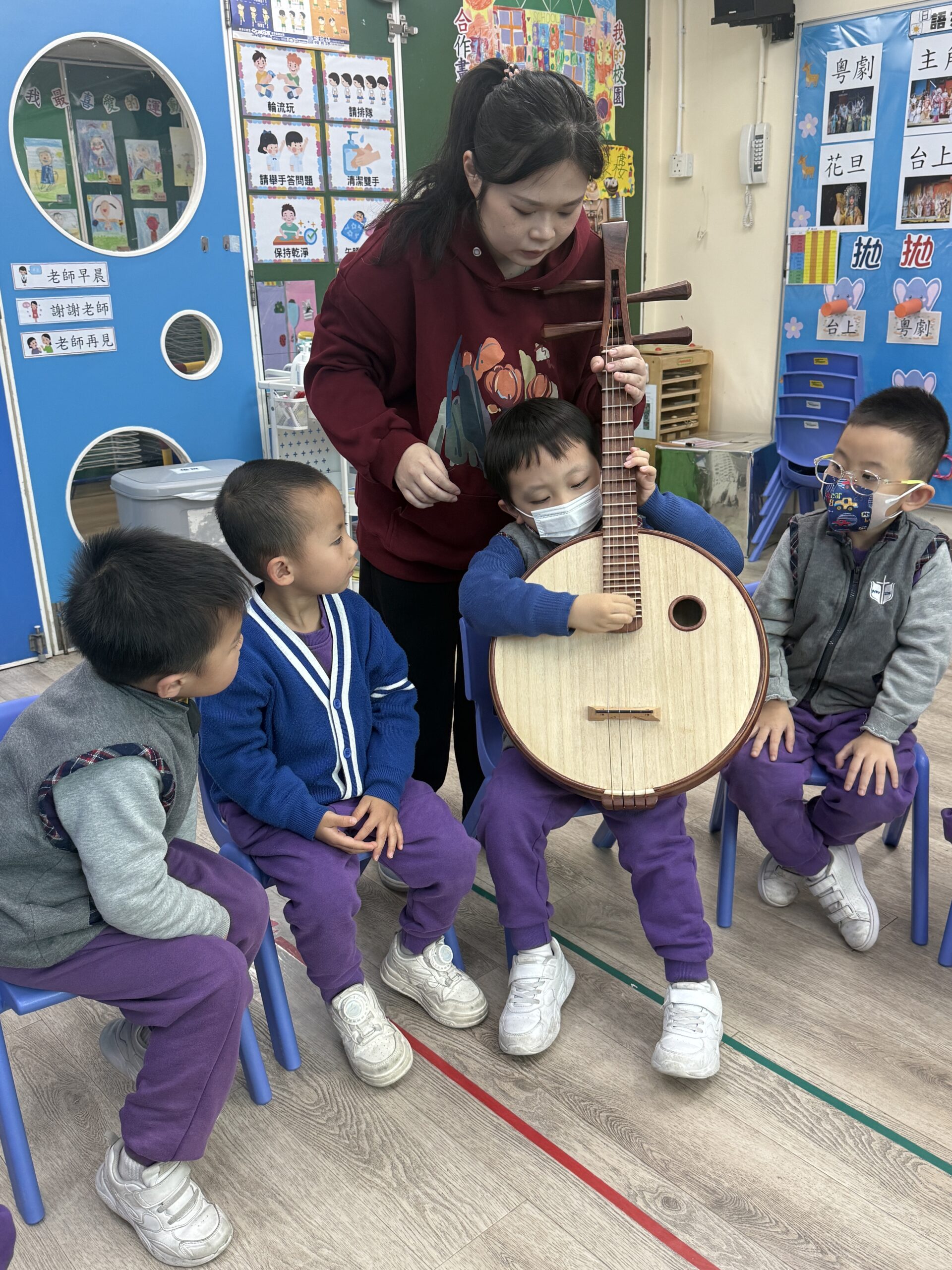 活動中,導師講述故事《電車小叮在哪裡?》。故事情節生動有趣,吸引了幼兒的注意力。在講述過程中,導師使用了琵琶,將故事情節與音樂完美融合,幫助幼兒更好地理解故事內容。幼兒們不僅聆聽了故事,還有機會親自試彈琵琶。這一環節激發了他們的興趣,讓他們感受到了中樂的魅力,並提高了他們的音樂表現能力。